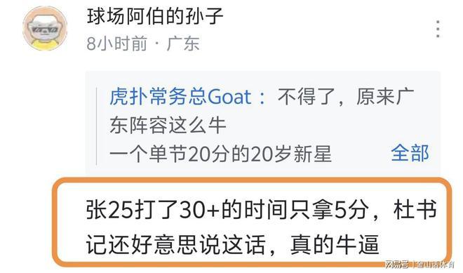 “多年广东球迷,谢谢杜指导之前的付出,现在可以带上25离开广东队了”;“张25打了30+的时间只拿5分,杜书记还好意思说这话,真的牛逼!”;“家政跟王洪泽快跑吧,这都能在记者会说出来的?”……