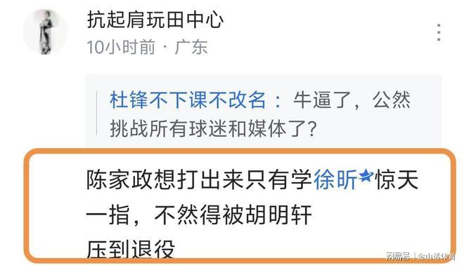 “把谁换下来呢?把谁的时间调少一点合适呢?”,杜锋的这番话,赛后引起了众多广东球迷的不满,纷纷在网络平台留言。“把你的时间调少一点,赶紧执包袱过主啦”;“张浩嘉:签对了公司底气就是足。”;“陈家政想打出来只有学徐昕惊天一指,不然得被胡明轩压到退役 ”。